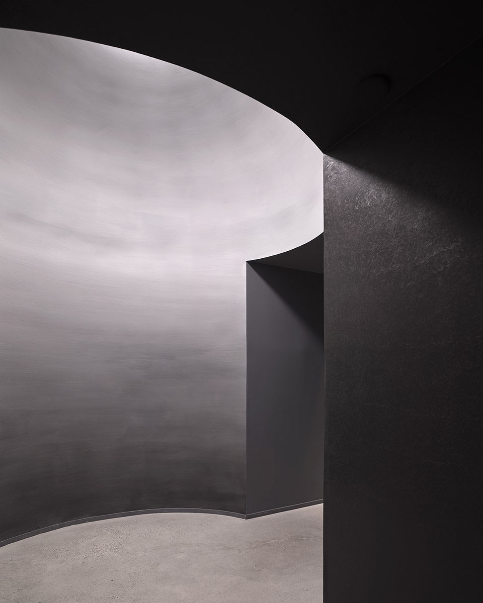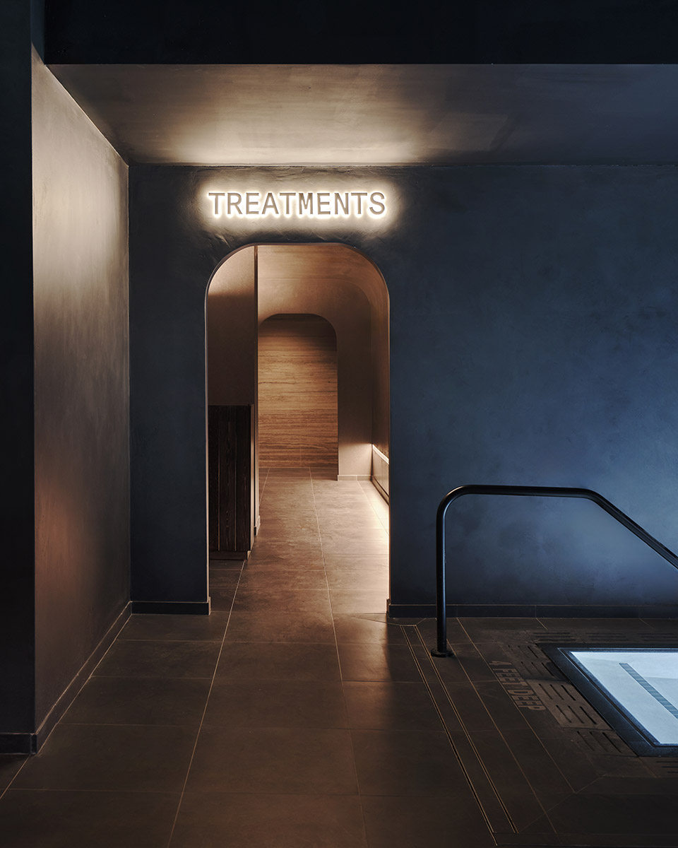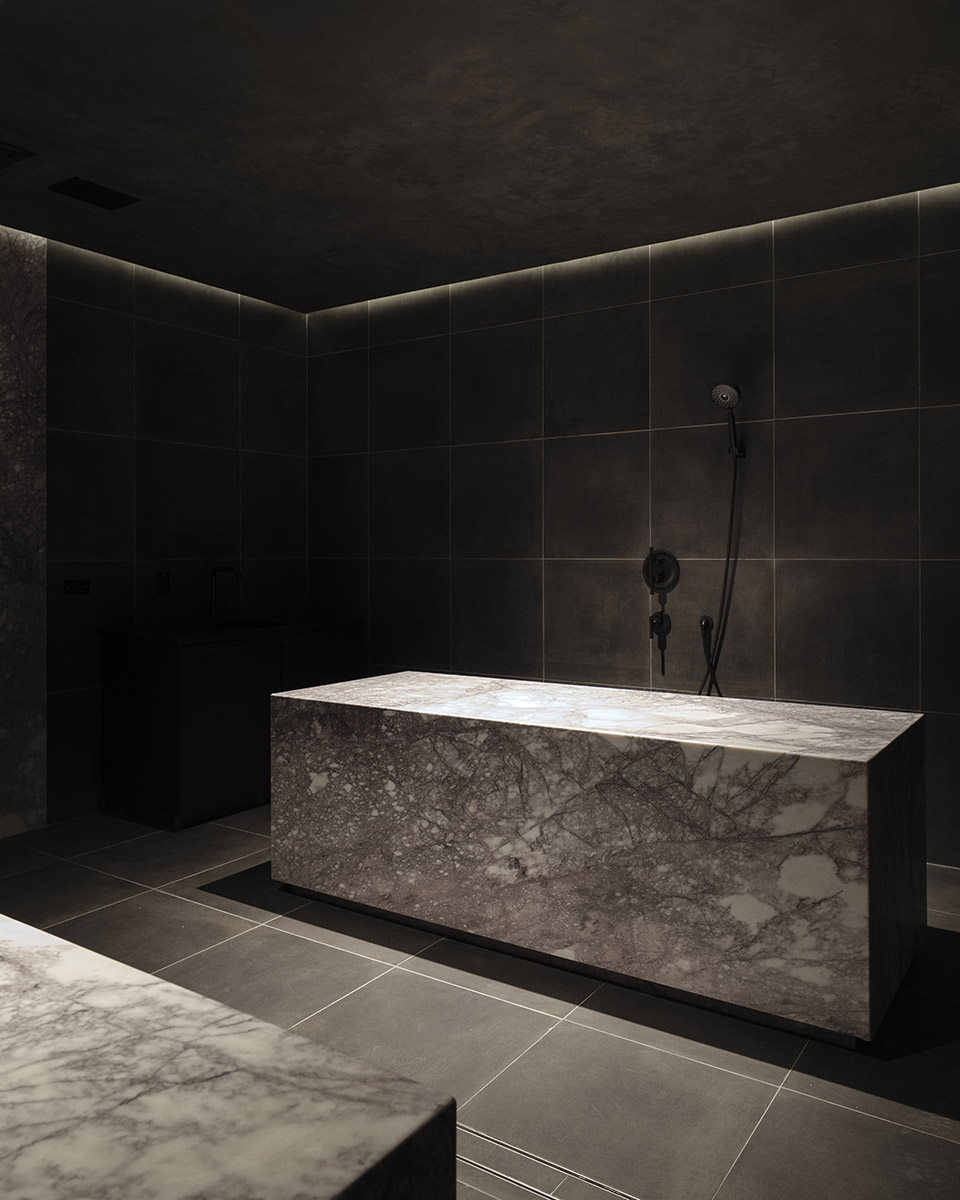 當客人通過一層的大堂進入Bathhouse,接待他們的是一個巨石般的接待臺,由石灰巖制成。照明凹槽玻璃門強調了客人的旅程和過渡,厚重的黑石后墻中央有一個垂直的燈塔,就像 “隧道盡頭的一盞明燈”。游客從一個小巧的黑色樓梯上走下來,這是引導他們踏上未知旅程的幾道門檻中的第一道。游客來到地下兩層中第一層的更衣室。