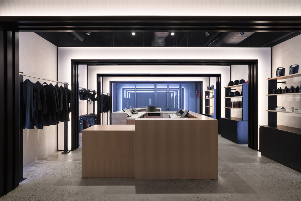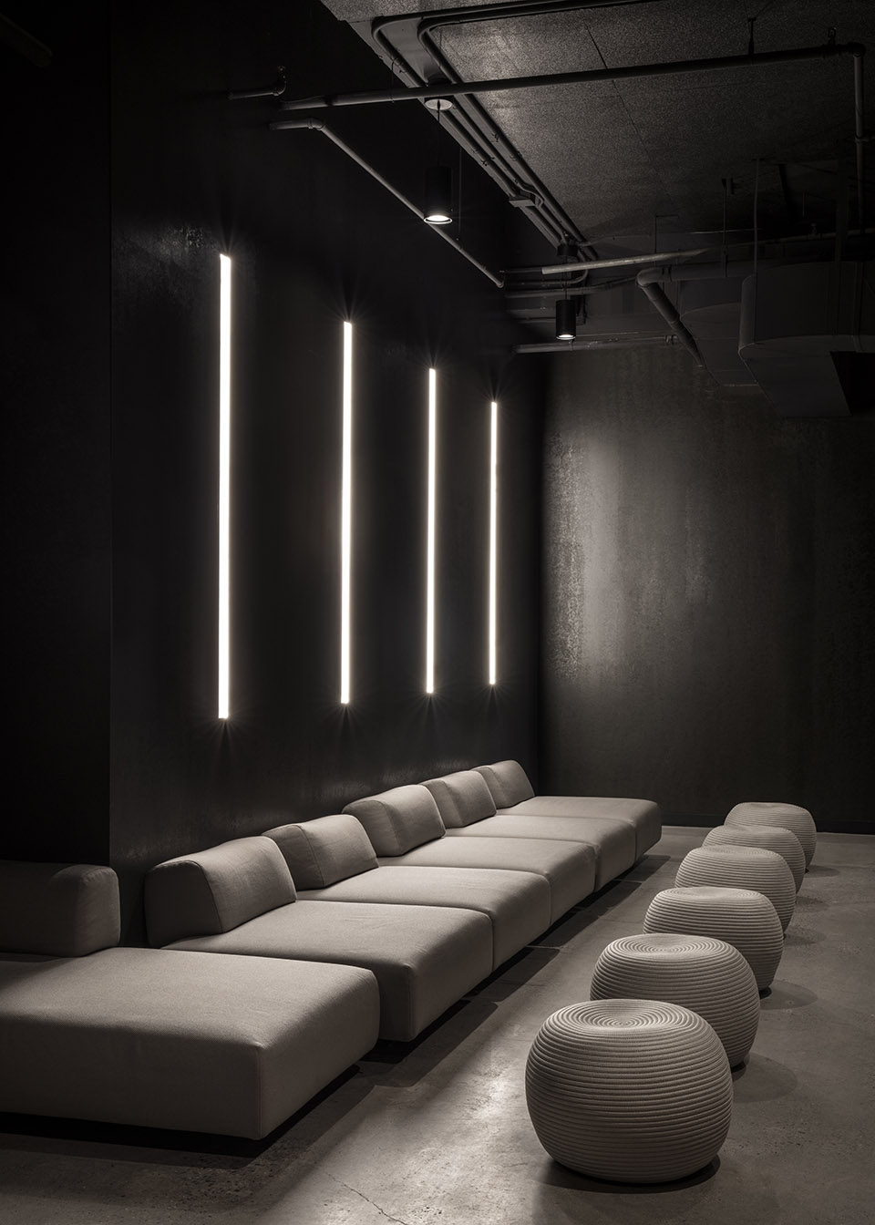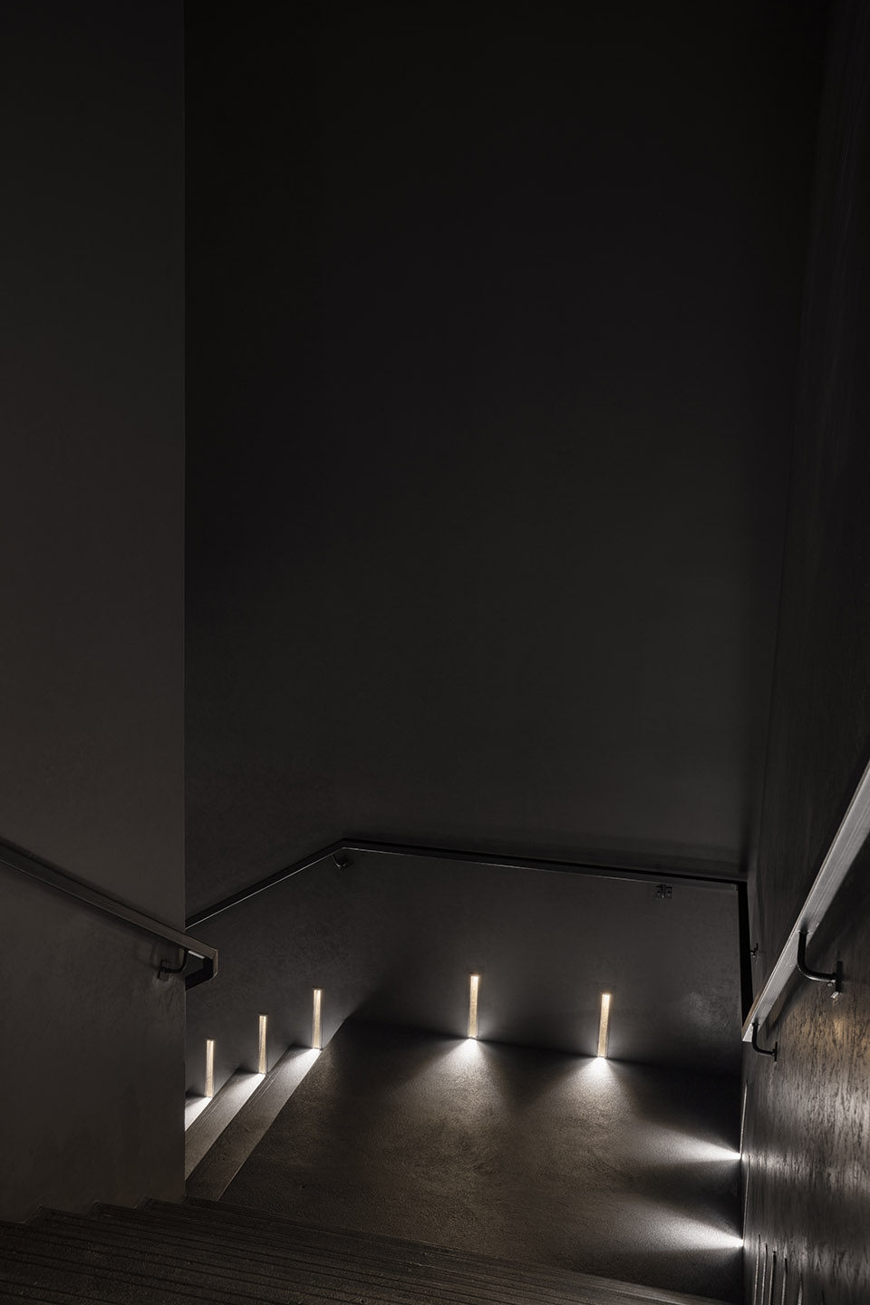 當客人通過一層的大堂進入Bathhouse,接待他們的是一個巨石般的接待臺,由石灰巖制成。照明凹槽玻璃門強調了客人的旅程和過渡,厚重的黑石后墻中央有一個垂直的燈塔,就像 “隧道盡頭的一盞明燈”。游客從一個小巧的黑色樓梯上走下來,這是引導他們踏上未知旅程的幾道門檻中的第一道。游客來到地下兩層中第一層的更衣室。