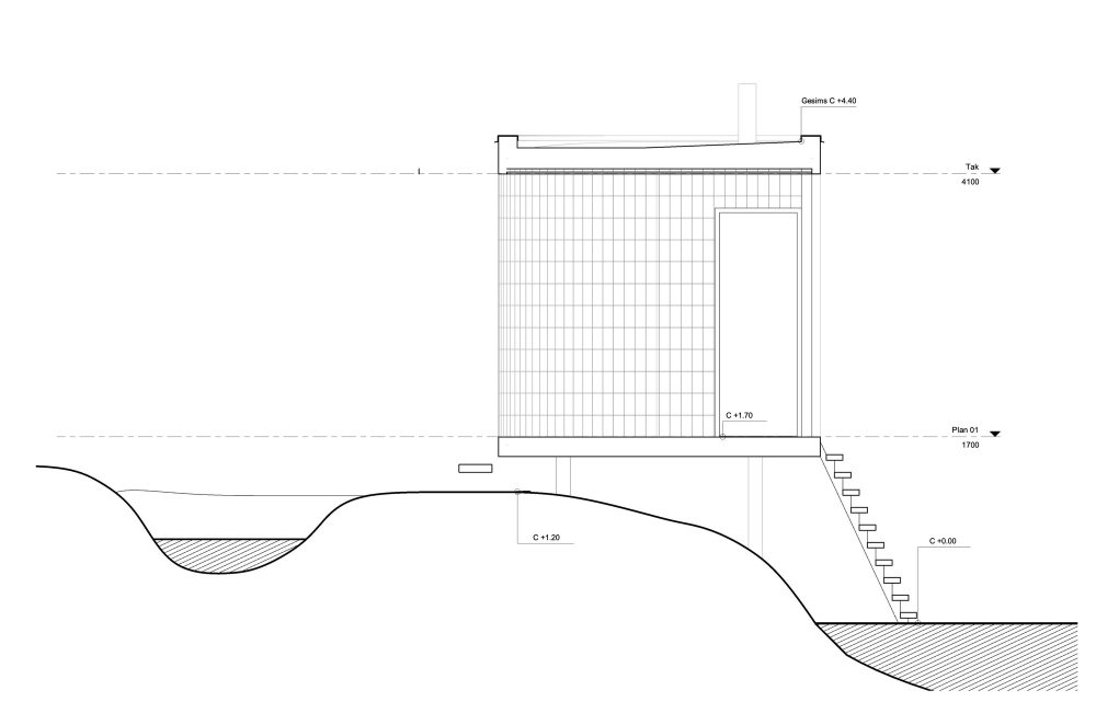 這種桑拿房概念由兩部分組成,由一條通向水和浴梯的開放式狹窄通道分割開來。右邊的部分有兩個小型更衣室和必需品儲藏室。左側是一個熱水間,配有一個木制火爐、一面圓潤、充滿社交氣息的后墻,以及一扇面向大城市天際線的全景窗戶。