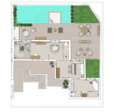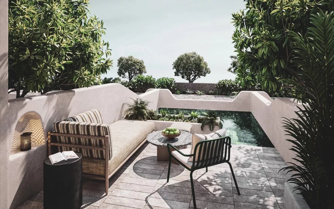 套房中的露臺具備私人泳池,陽光下,就像散落花園中寧靜而閃亮的寶石。