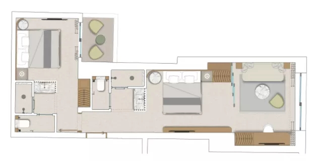 面積為 60㎡ 的私人套房位于酒店一層,帶戶外花園景觀及私人泳池,室內有臥室和獨立的客廳;擁有兩間臥室的套房則為45㎡,同樣設有獨立的客廳;每套每晚的房價在人民幣2500元-3000元之間。