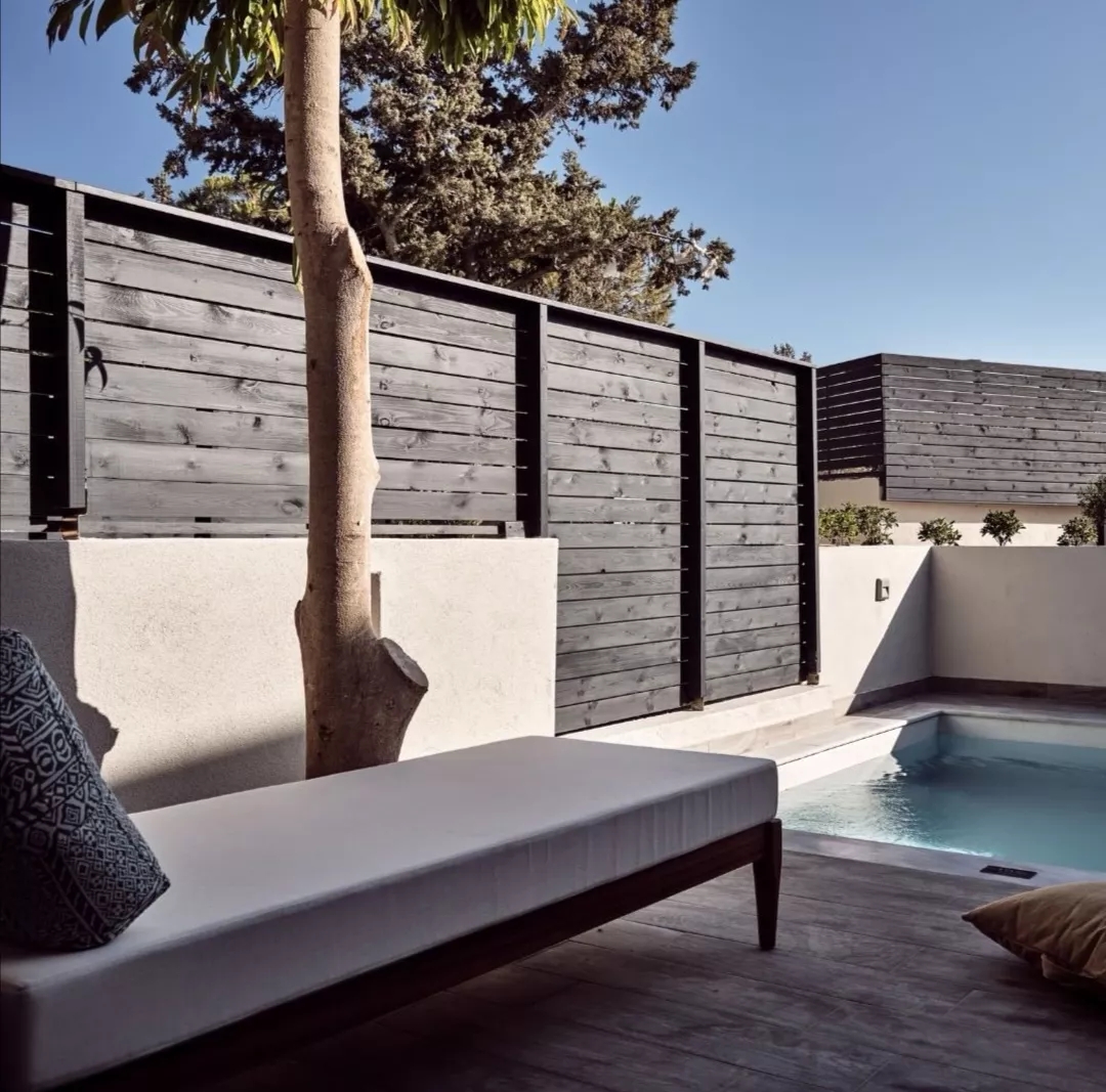 一排整齊栽種的檉柳樹隔斷了愛琴海浪花的喧囂,灰色樹干和灰綠的葉子質樸、新鮮、充滿活力與質感,仿佛在宣示 Numo Ierapetra 度假酒店的格調。