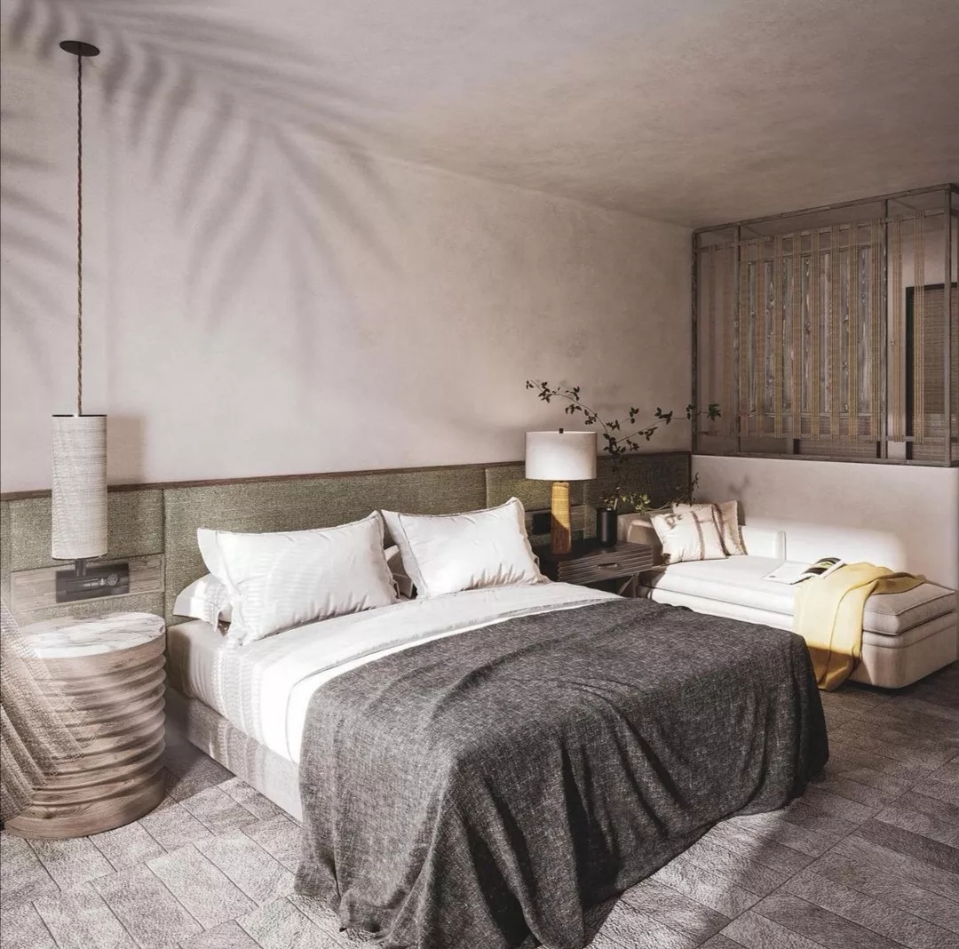 客房延續公區的奶油色水泥墻面,設計簡約、質樸。在家具、軟裝、客用品的選擇上,以原木色的家具搭配棉麻織物,讓房間內充滿自然、原始的氛圍,加強了溫度感。
