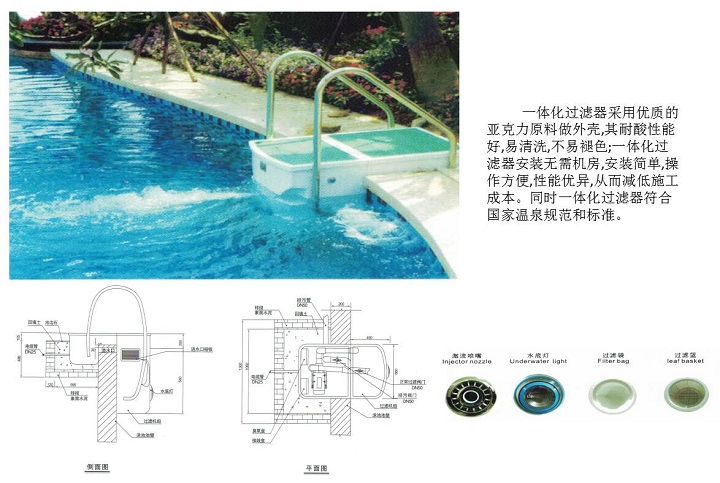 采用優質的亞克力原料做外殼,其耐酸性能好,易清洗,不易褪色;一體化過濾器安裝無需機房,安裝簡單,操作方便,性能優異,從而減低施工成本。同時一體化過濾器符合國家溫泉規范和標準。